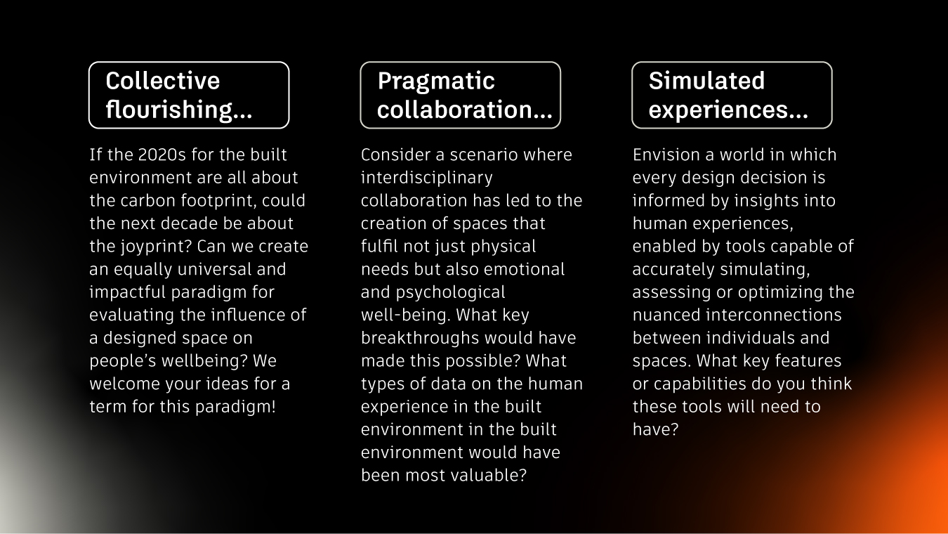 Satisfied with this experiment, we are expanding the conversation with a similar dinner experience in London, followed by focused online workshops. In the meantime, a number of our dinner attendees kindly discussed their work in more detail in the Encoding Experience Research Connection series. In the future, we hope to engage on a 10 questions paper to spur more research that will further human-centric design focus in industry, be it via development of new metrics, datasets, breakthroughs in understanding of human perception or, “simply” new workflows and tools for the AEC industry. We are also excited for anyone looking to collaborate in this space, particularly in the context of seeding human experience data ecosystems for academic study, to get in touch.