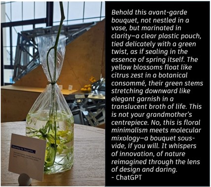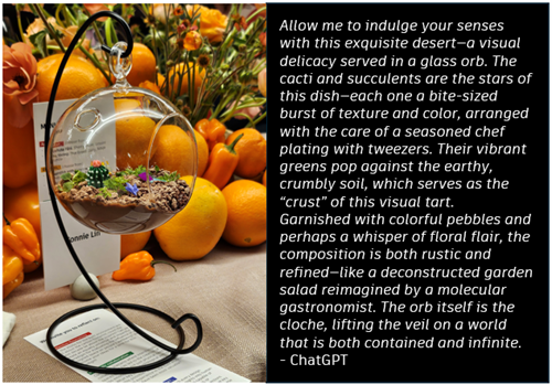Fueled by culinary delights, like the showstopping dessert featuring edible tiny gardens in suspended globes that had everyone reaching for their phones (Figure 1b), we embarked on a collective journey, exploring a new frontier in design. Microphones, hidden in the scenery, captured every spoken thought – with full knowledge of the participants, of course!