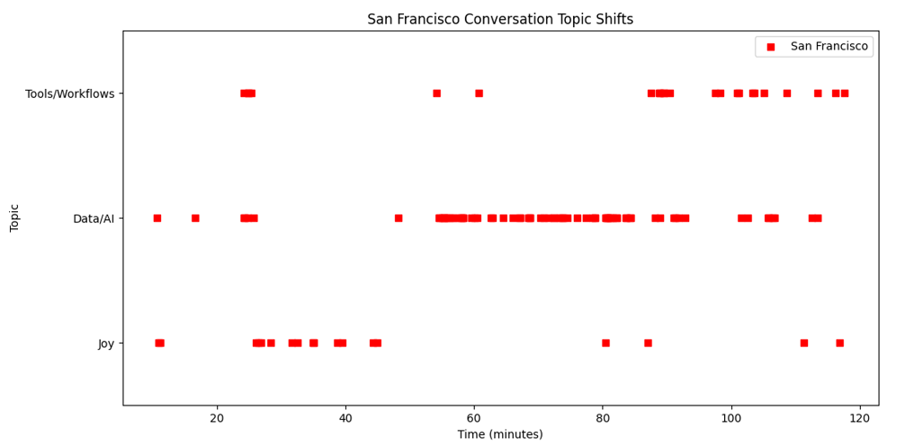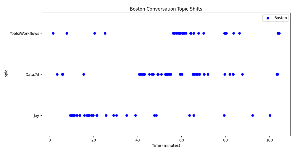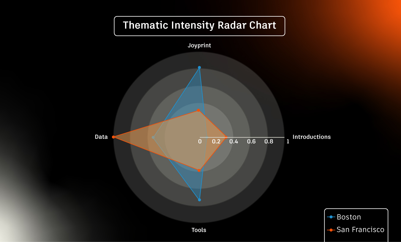 The conversations meandered in their own unique ways, with the group in Boston spending 49% more time on the first, joyprint prompt and 82% more time on the third, tools and workflows prompt. Meanwhile, San Francisco moved on more swiftly, but found itself fascinated with the second, data-related prompt, spending 179% more time on that discussion than the Boston attendees. That said, perhaps due to the guests having knowledge of all prompts apriori, concepts related to other prompts were interwoven within the three broad sections of discussion. Therefore, we also looked at sets of keywords related to each prompt throughout the whole conversation. Figure 2 highlights their appearances over the duration of dinners in Boston and San Francisco respectively. Figure 3 synthesises the data of time spent on sections of the conversation and the frequency of topical keywords to provide a more weighted view on the focus of each dinner.