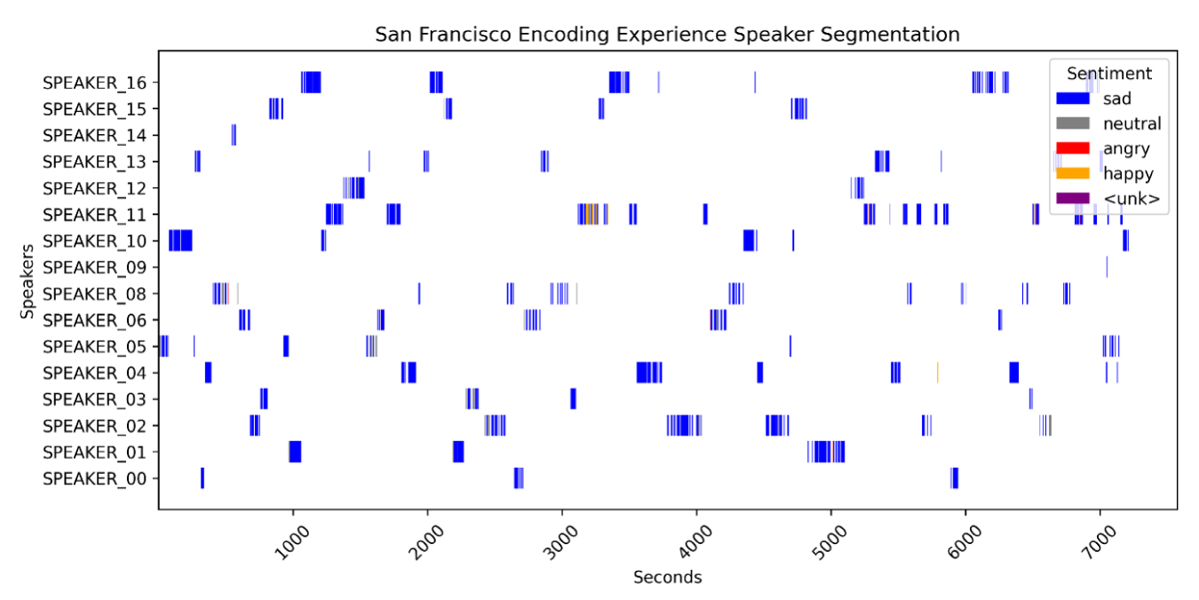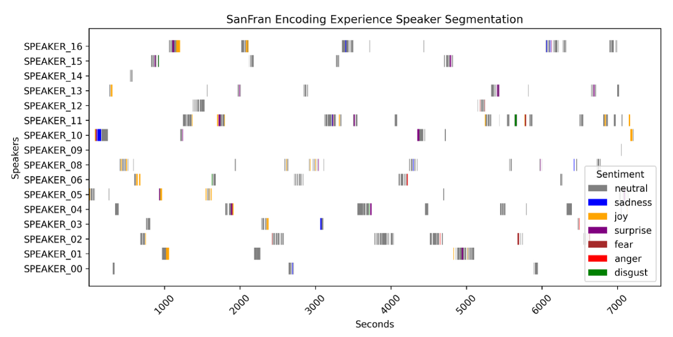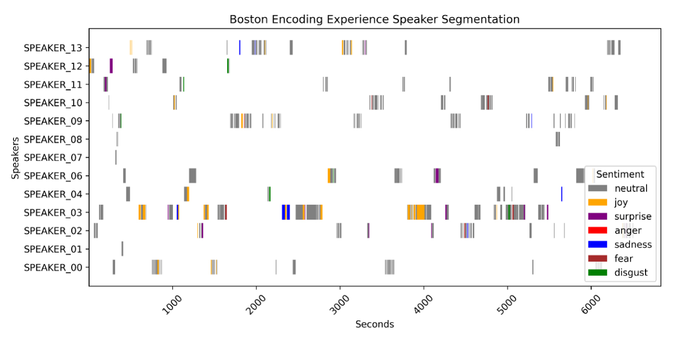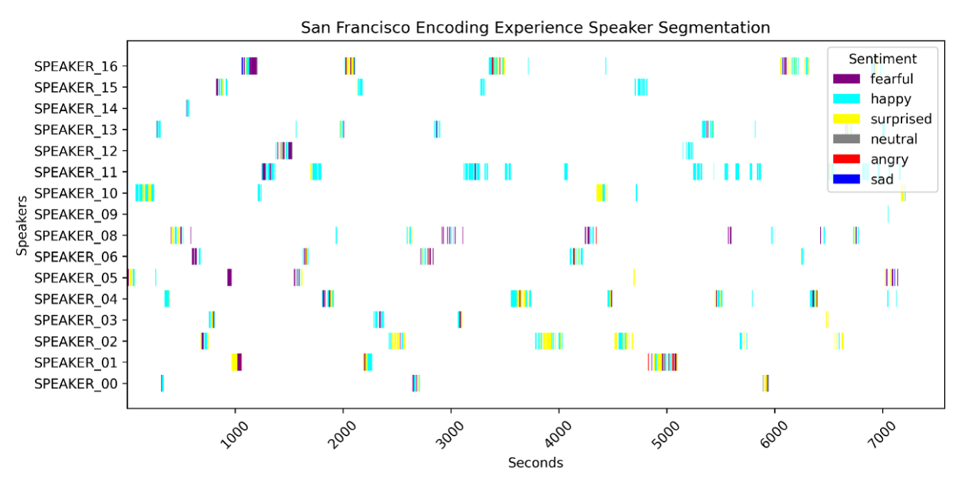 We performed emotional analyses of the conversations using various strategies. First, we processed the audio to increase the volume, reduce background noise (including the clattering of plates and utensils), and enhance the clarity of the voices. Using speaker diarization software, we identified the times at which guests spoke throughout the evening (Figure 4), which enabled us to determine the emotional nuances expressed by each speaker. For efficiency and data clarity, we limited our analysis to speaker interjections of greater than 5 seconds.