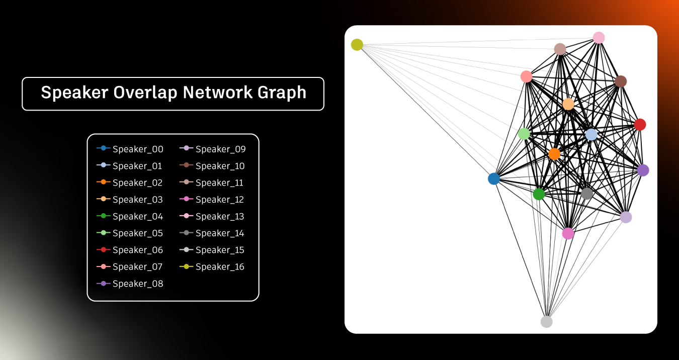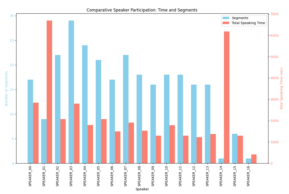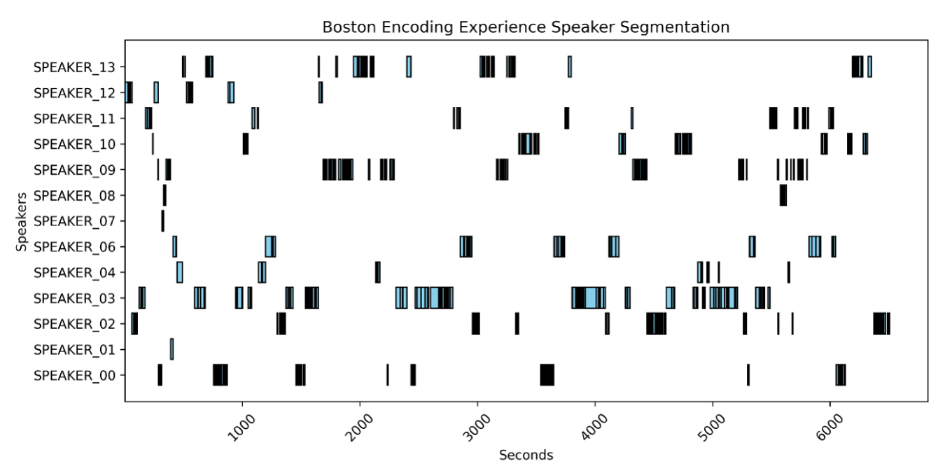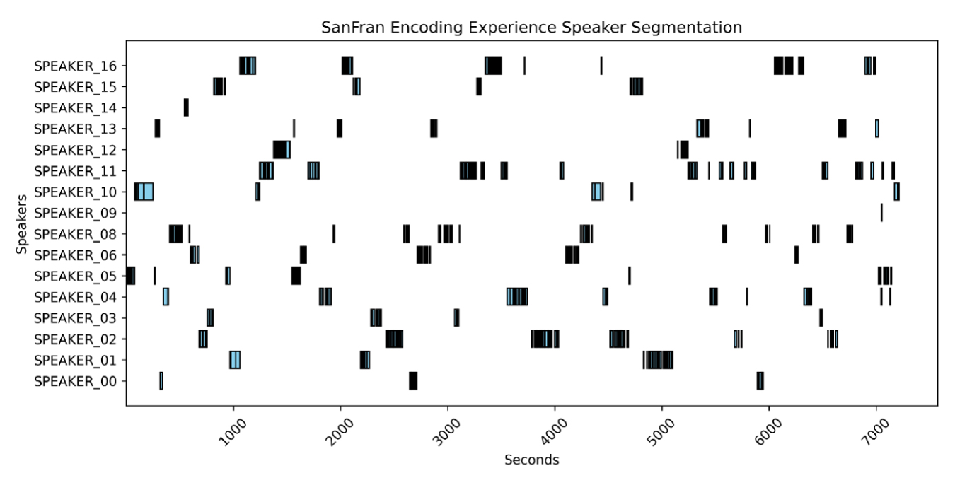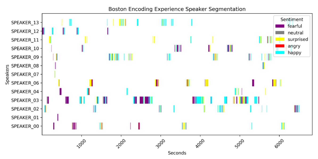We performed emotional analyses of the conversations using various strategies. First, we processed the audio to increase the volume, reduce background noise (including the clattering of plates and utensils), and enhance the clarity of the voices. Using speaker diarization software, we identified the times at which guests spoke throughout the evening (Figure 4), which enabled us to determine the emotional nuances expressed by each speaker. For efficiency and data clarity, we limited our analysis to speaker interjections of greater than 5 seconds.