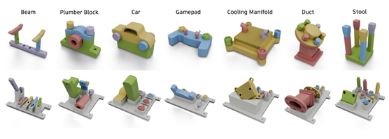 • Benchmarks: We introduce seven multi‑part assemblies (5–9 parts) spanning everyday and industrial forms—e.g., a stool, duct, gamepad shell, cooling manifold, and more—to cover different geometries and assembly strategies.