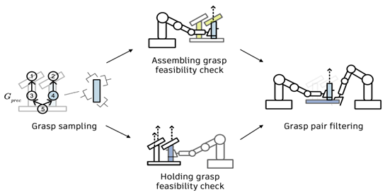 Dual‑arm grasp filtering samples candidate grasps, then filters them for stability, reachability (IK), and inter‑arm collision.