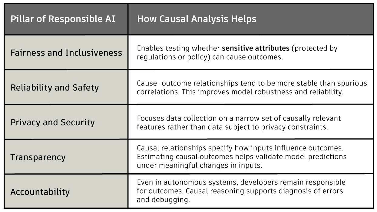 As autonomous systems increasingly make high-stakes decisions, including coding agents, credit approvals, and medical diagnosis, correlation-based analysis alone is not adequate. Responsible AI requires systems that are explainable, can withstand stress tests, and be held accountable for their decisions.