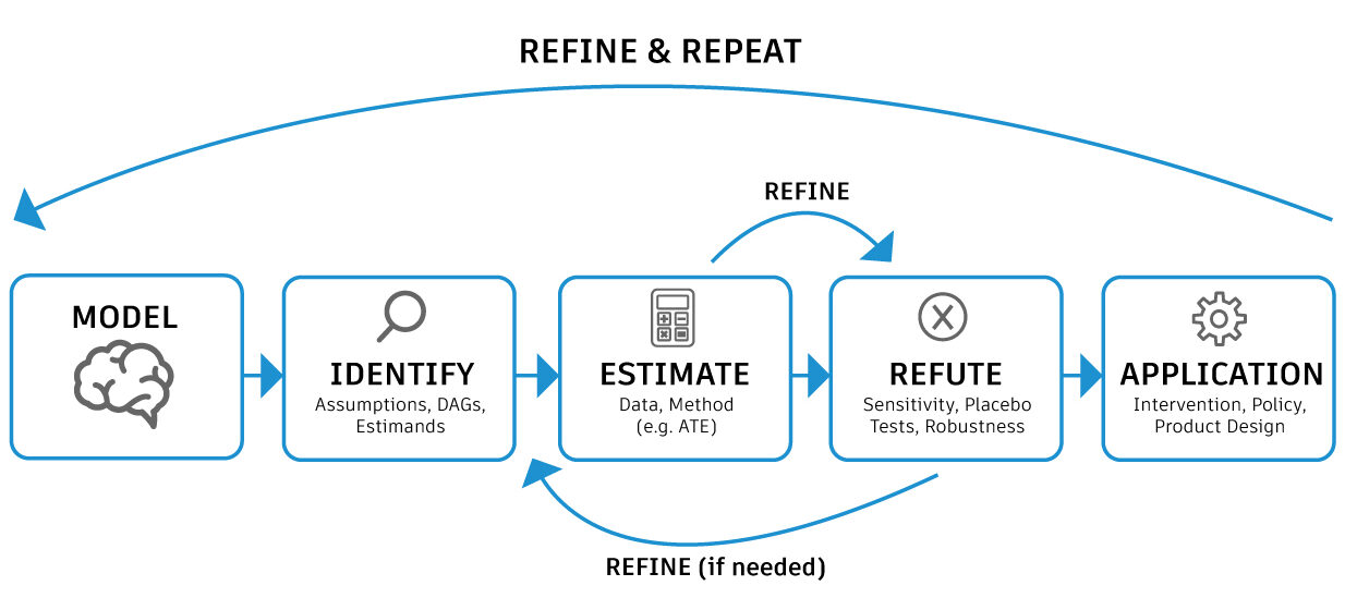 Fig 2. A causal inference pipeline: Modelling involves creating an acyclic causal graph with edges connecting the cause to the effect. ATE (Average Treatment Effect) is the average difference in outcomes for the treatment versus the control group.