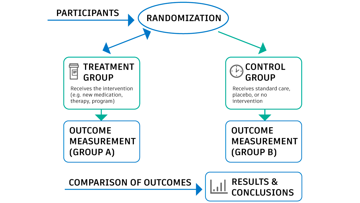 Fig.1 Diagram illustrating a randomized controlled trial (RCT). A placebo is a fake medicine/treatment given to the control group that does not contain an active medical ingredient, for example a sugar pill.