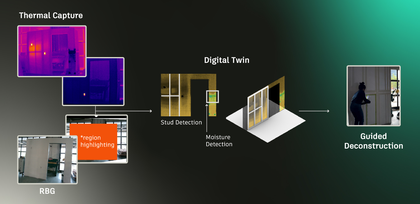 Autodesk Research is developing and testing a system that combines limited multimodal data like thermal imaging, radiofrequency, and GIS data with machine learning techniques to evaluate building materials non-destructively. Like a doctor uses advanced imaging to diagnose a patient, our technology aims to peer beneath the surface of walls, detect studs and other hidden elements, assess material conditions beneath wall surfaces, and identify reusable materials with remarkable accuracy.