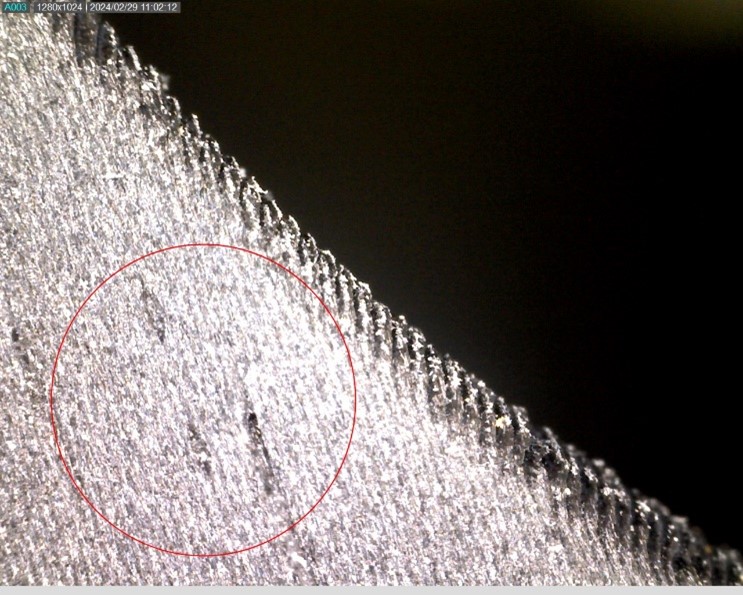 After two days of testing with no observed decay in the load, we paused the process to inspect the motor mount. Typically, a fatigue test would run until part or assembly failure, but we were curious to check for any internal damage that might not be immediately evident. We did notice a mark in the component that could potentially initiate cracking. However, upon further inspection, we concluded that this mark was a result of an initial printing error, not fatigue-induced delamination. Such printing faults, where layers join, are common and in this instance, did not affect the component’s performance.