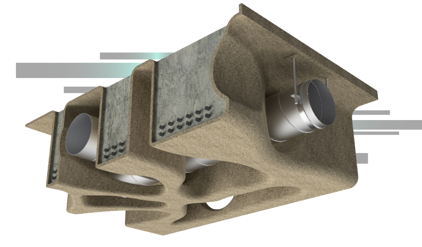 The formwork: Instead of temporary wooden formwork that’s stripped and discarded, we used Additive Tectonics’ econitWood, an upcycled wood-mineral composite that locks in biogenic carbon and works with their SCA printing technology. Using Autodesk Inventor Nastran, we optimized the geometry to remove excess material and reinforce only where needed, producing a ribbed form that follows the slab’s load paths.