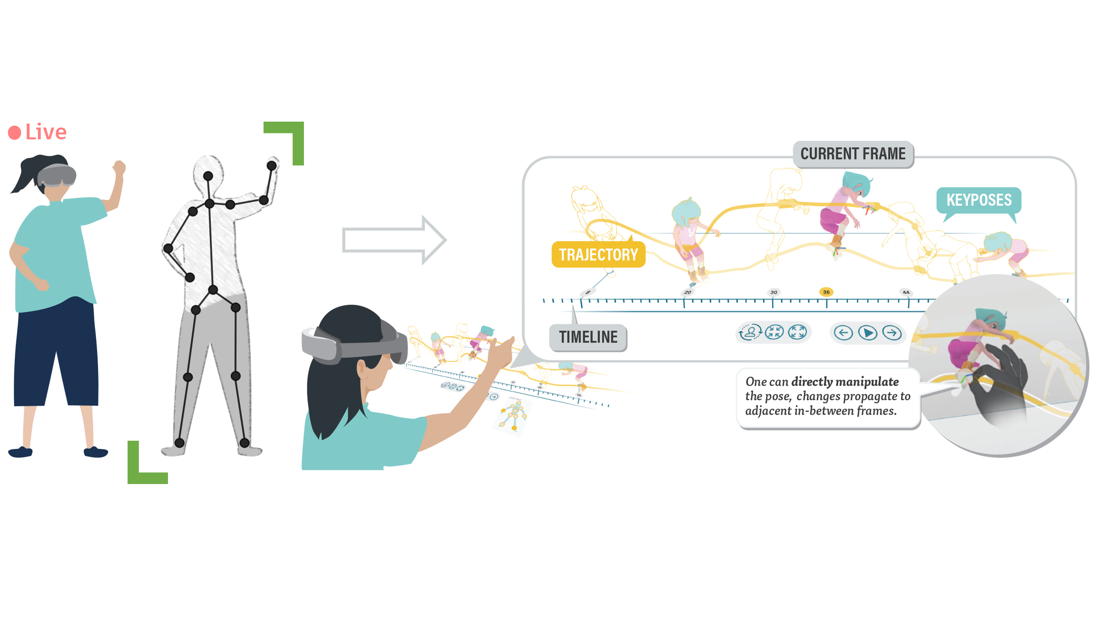 Editing character motion in Virtual Reality requires working with both spatial and temporal data using controls with multiple degrees-of-freedom. The spatial and temporal controls are separated, making it difficult to adjust poses over time and predict the effects across adjacent frames. To address this challenge, the team introduced TimeTunnel, an immersive motion editing interface that integrates spatial and temporal control for 3D character animation in VR. TimeTunnel provides an approachable editing experience via keyposes, a set of representative poses automatically computed to concisely depict motion, and trajectories, 3D animation curves that pass through the joints of keyposes to represent in-betweens. TimeTunnel integrates spatial and temporal control by superimposing trajectories and keyposes onto a 3D character.