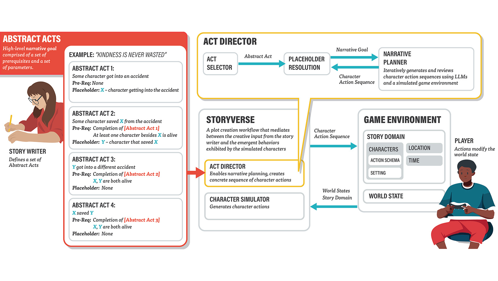 Automated plot generation for games enhances the player’s experience by providing rich and immersive narrative experience that adapts to the player’s actions. Traditional approaches adopt a symbolic narrative planning method, which limits the scale and complexity of the generated plot by requiring extensive knowledge engineering work. Recent advancements use Large Language Models (LLMs) to drive the behavior of virtual characters, allowing plots to emerge from interactions between characters and their environments. However, the emergent nature of such decentralized plot generation makes it difficult for authors to direct plot progression. In this paper, the team proposes a novel plot creation workflow that mediates between a writer’s authorial intent and the emergent behaviors from LLM-driven character simulation, through a novel authorial structure called “abstract acts.” The process creates “living stories” that dynamically adapt to various game world states, resulting in narratives co-created by the author, character simulation, and player.