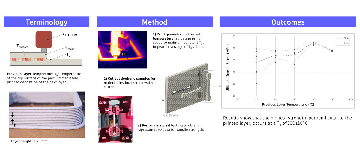 This study investigates the effect of the temperature at the interface between layers on the ultimate tensile strength (UTS) of 3D printed parts made with post-industrial PETG (PIPG). Fiber-reinforced polymers are gaining popularity in large-scale material extrusion, which involves the layer-by-layer deposition of melted polymeric granulates. This study identifies an optimal previous layer temperature (Tp) of 130±10°C, where interlayer bonding and material properties are maximized. An upper limit of 150°C is identified to avoid material sagging and a critical lower bound of approximately 113°C for achieving at least 80% of the maximum part strength. Moreover, the study underscores the importance of considering the effective cross-sectional area due to the ridged surface of printed samples.