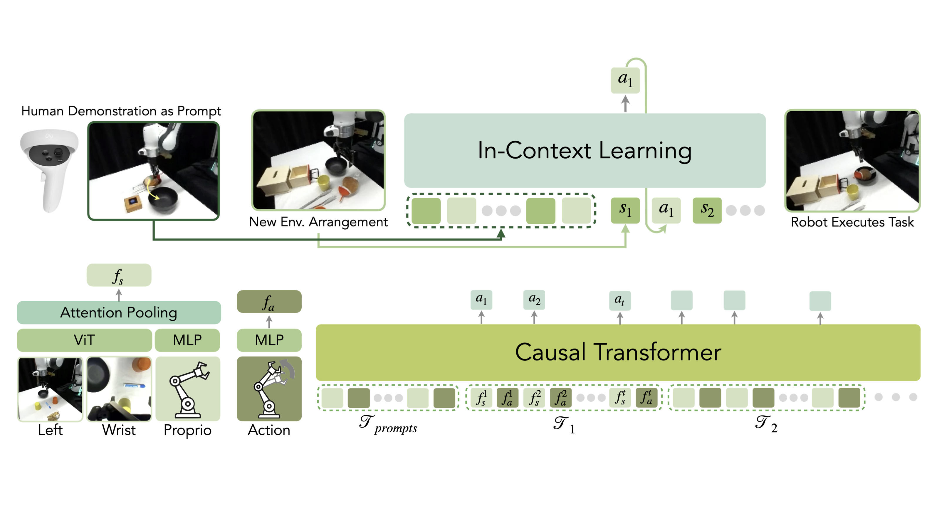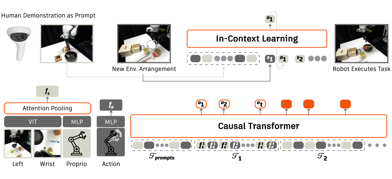 This paper explores how to enable in-context learning capabilities of next-token prediction models for robotics, allowing the model to perform novel tasks by prompting it with human teleop demonstration examples without fine-tuning. In-Context Robot Transformer (ICRT) is a causal transformer that performs autoregressive prediction on sensorimotor trajectories, which include images, proprioceptive states, and actions. This approach allows flexible and training-free execution of new tasks at test time, achieved by prompting the model with demonstration trajectories of the new task. In a multi-task environment setup, ICRT significantly outperforms current state-of-the-art robot foundation models on generalization to unseen tasks.