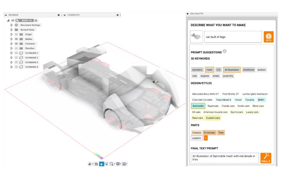 3DALL-E integrates a state-of-the-art text-to-image AI (DALL-E) into the 3D CAD software Fusion 360. This plugin generates 2D image inspiration for conceptual CAD and product design workflows. 3DALL-E helps users craft text prompts by providing 3D keywords, design/styles, and parts from GPT-3. Users can also generate from image prompts based on a render of their current workspace, letting users use their 3D modeling progress as a basis for text-to-image generations.
