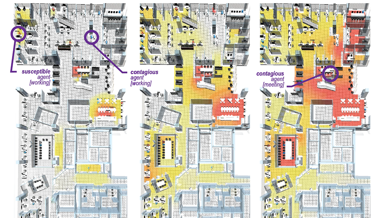 Published at Sustainable Cities and Society 2023, this paper proposes a generative design workflow that integrates a stochastic multi-agent simulation with the intent of helping building designers reduce the risk posed by COVID-19 and future pathogens. The custom simulation randomly generates activities and movements of individual occupants, tracking the amount of virus transmitted through air and surfaces from contagious to susceptible agents.
