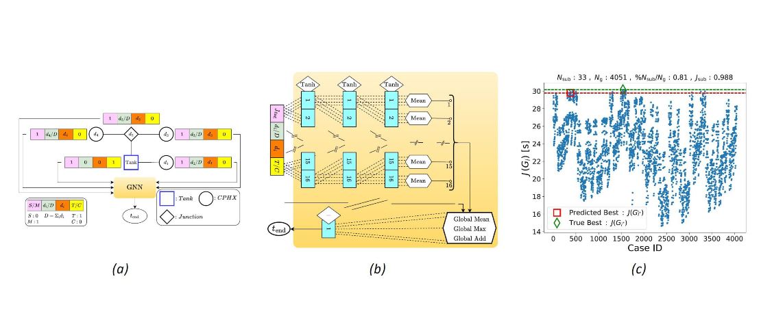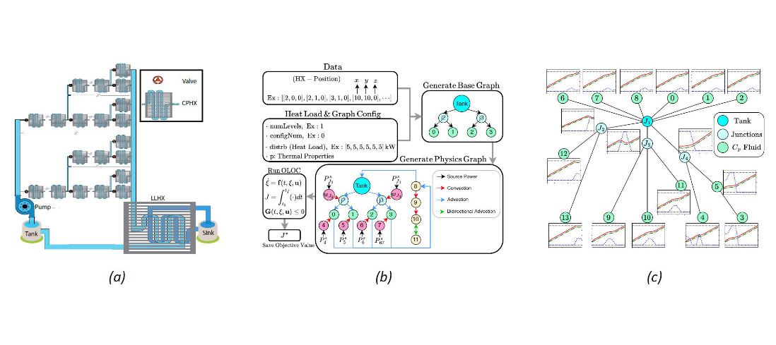 This team developed a graph-based framework to represent various aspects of optimal thermal management system design, with the aim of rapidly and efficiently identifying optimal design candidates. The graph-based framework is used to generate diverse thermal management system architectures modeled under various loading conditions with an open-loop optimal controller employed to determine each system’s optimal performance. In the subsequent step, a Graph Neural Network (GNN) model is trained on 30% of the labeled data to predict the systems’ performance. With this trained model, the team estimated the performance values for the remaining 70% of the data, which serves as the test set. This targeted approach concentrates on evaluating higher-ranked designs identified by the GNN, replacing the exhaustive search (enumeration-based) of all design cases.