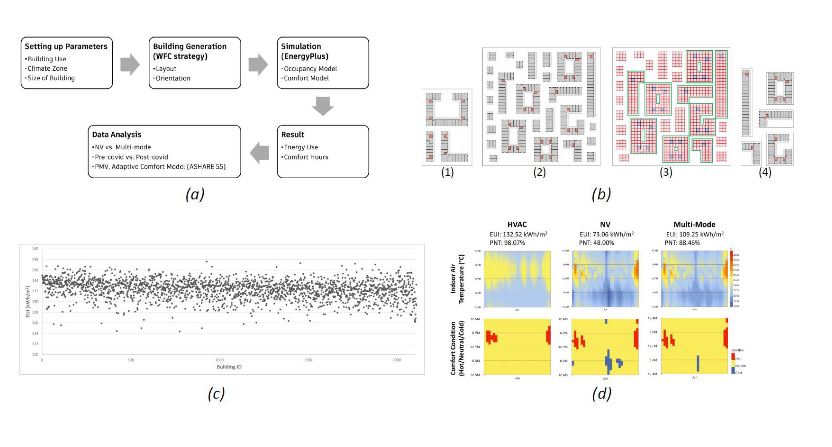 This research explores the benefits of incorporating natural ventilation (NV) simulation into a generative process of designing residential buildings to improve energy efficiency and indoor thermal comfort. The team’s proposed workflow uses the Wave Function Collapse algorithm to generate a diverse set of plausible floor plans. It also includes post-COVID occupant presence models while incorporating adaptive comfort models. The team conducted four sets of experiments using the workflow, and the simulated results suggest that multi-mode cooling strategies combining conventional air conditioning with NV can often significantly reduce energy use while introducing only slight reductions in thermal comfort.
