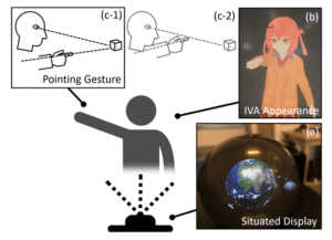 This paper was published at the Graphics Interface Conference in 2022 and explores how to design an intelligent virtual agent (IVA) that can point from the virtual to the real world and have users recognize where it is pointing based on perceptual cues. The team designed an IVA with factors including a situated display, appearance, and pointing gesture strategy.
