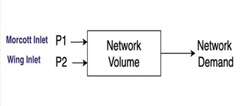 We have also prepared the generalized version of the above complex structure representing all the reservoirs in a single tank (Total Network Volume) and combining all the demands in the single (Total Network Outlet). The control setpoints are the Total Inlet Flow (Morcott Inlet + Wing Inlet) representing the main source of the inlet for the plant. We performed a set of experiments for this simpler version of network shown in Fig. 2 and considered three objectives while training the RL agent: