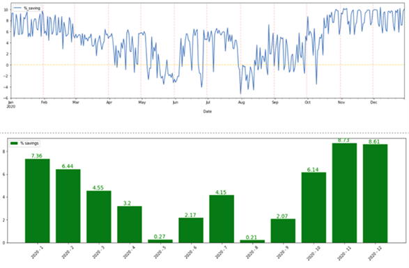 We also conducted a thorough cost-savings analysis for every day of the year 2020. The following time-series and bar chart (Fig. 3) represents the daily and monthly aggregated cost savings for 2020. Yearly average saving percentage comes out ~4.5% and fairly distributed over months.
