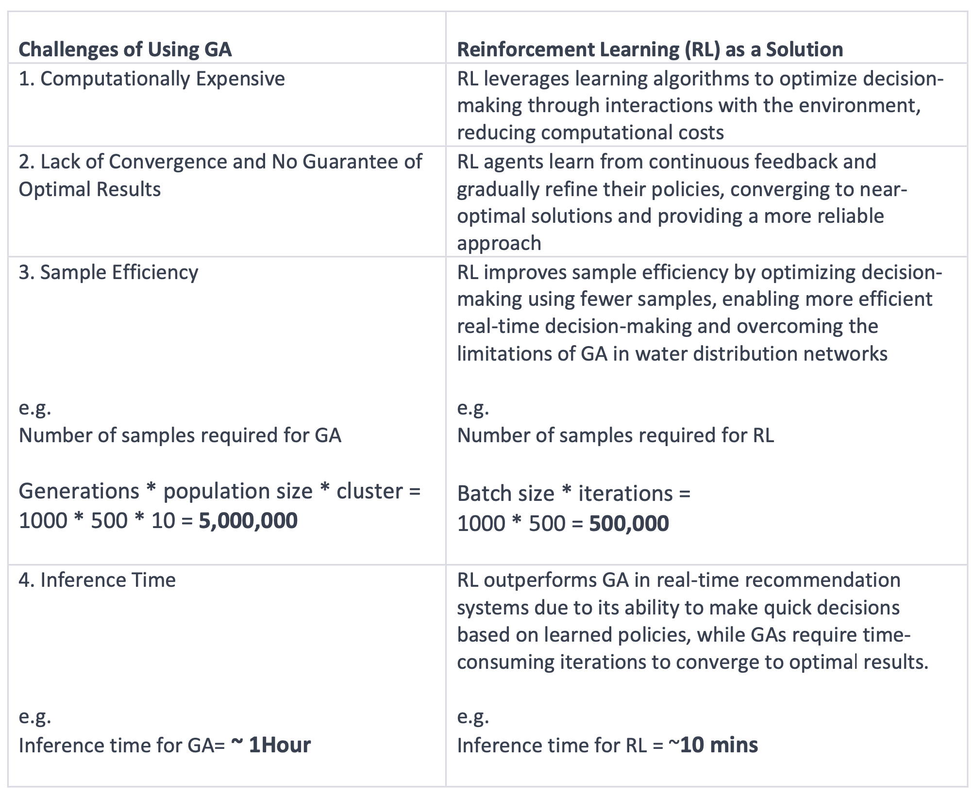 Based on our research, RL surpasses GA in various aspects including computation efficiency, lack of convergence, absence of guaranteed optimal results, sample efficiency, and inference time.