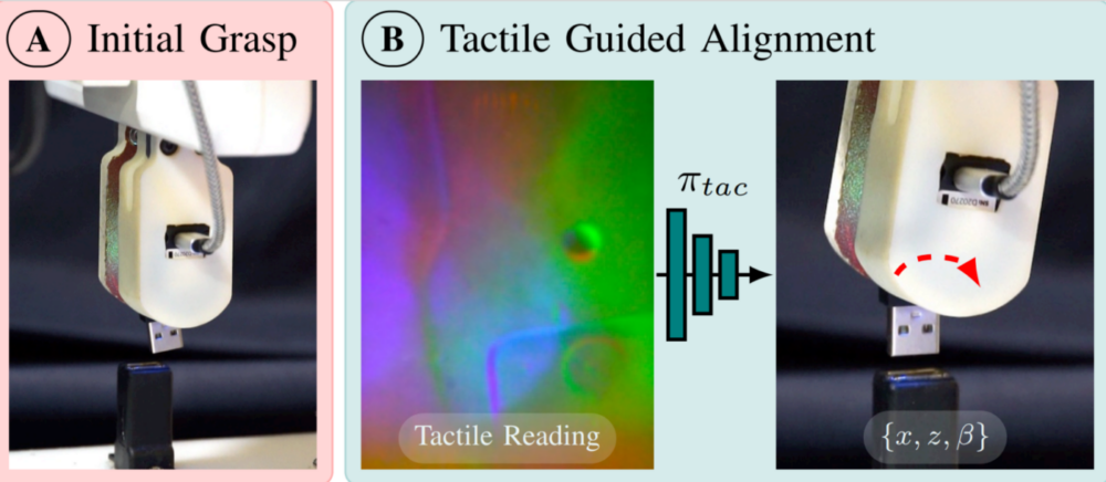In the Align phase, the robot uses tactile sensing to estimate how it’s holding the USB plug. It then re-orients the plug to align it with the insertion axis. In the next Insert phase, the robot learns to finish the insertion based on RGB images from the camera. The videos below show the safe data collection process for the two phases.