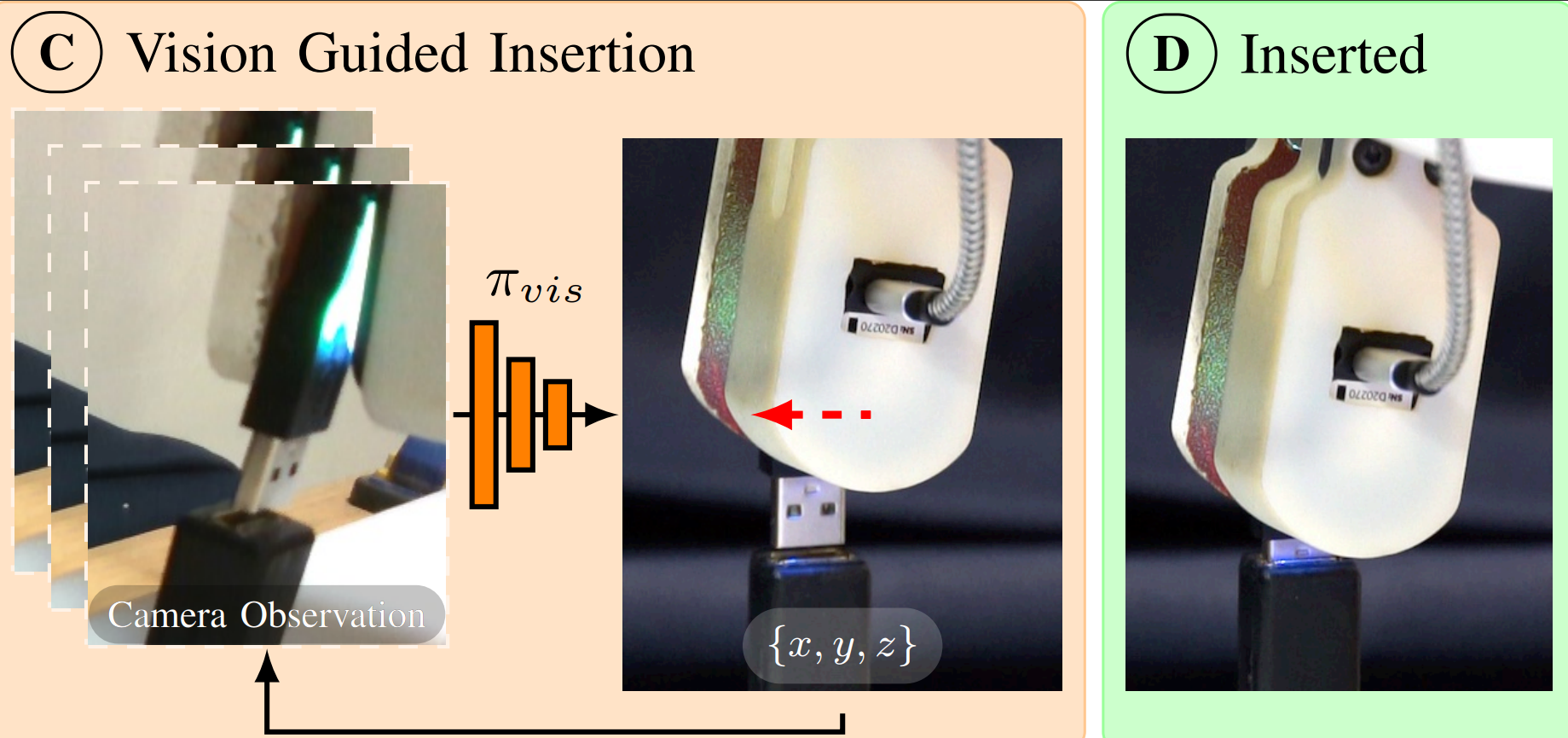 Industrial insertion is a difficult task for robots to perform. As an example, think about inserting a USB plug – the tolerances are tight, the USB socket is often not visible, and even a slight misalignment could lead to failure. Tasks like these are easy for people as we rely on the sense of touch in our fingers and do well even without being able to see the USB socket. We can tell how the USB plug is held in our fingers and modify the insertion motion accordingly. Robots must learn how to plug a connector in, but learning with robots is inherently unsafe – a person needs to babysit the robot to make sure it’s not about to try something that will break the USB plug or socket in the process. So we asked the question: how can we get a robot to learn complex tasks like USB insertion safely while being able to adjust to small variations in how it’s holding the part or where the insertion socket is?