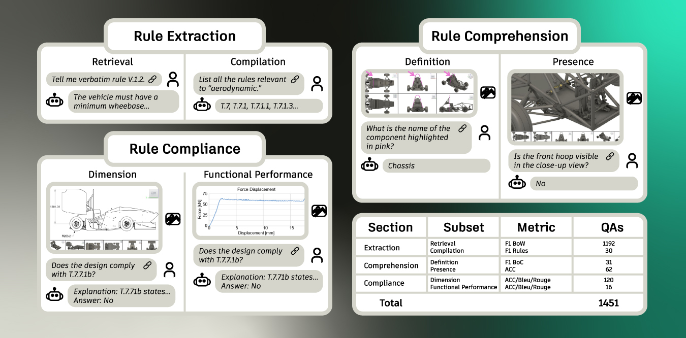 We built DesignQA to test this question: Can LLMs make sense of a real engineering rulebook? Using the 2024 Formula SAE racing rules, spanning material specs, safety limits, and dimensional tolerances, we developed a dataset of 1,451 questions that span a wide spectrum: