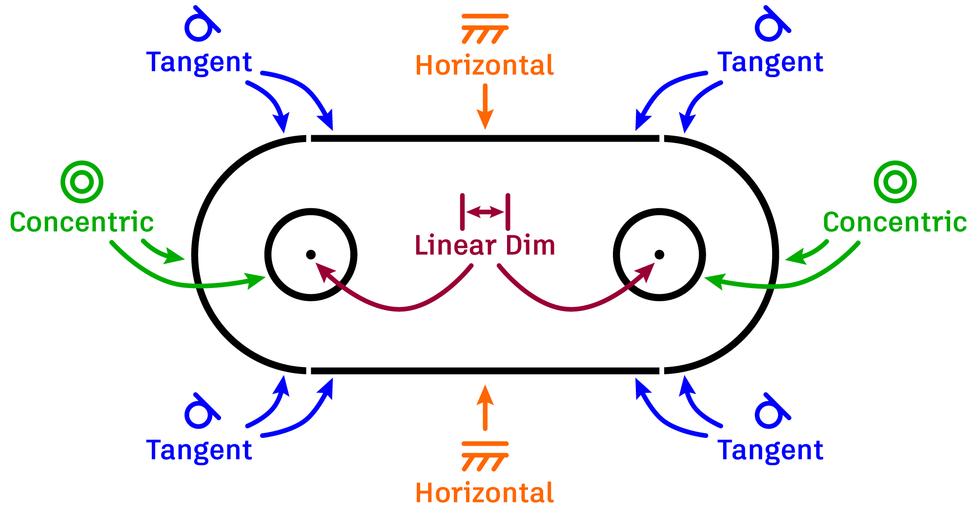 In the sketch below, tangent constraints (blue) reference a line and an arc, horizontal constraints (orange) reference two lines, and linear dimensions (red) reference two points.