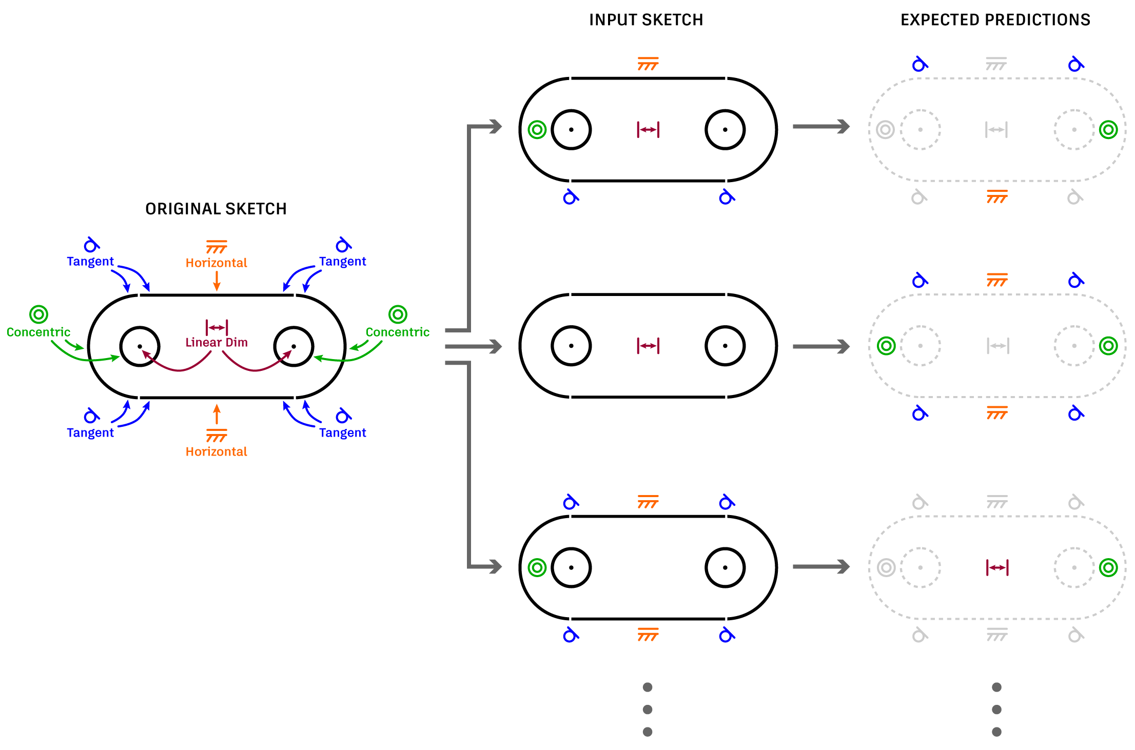 Using this methodology, we train our model to respect existing constraints and dimensions when suggesting a completion. This allows us to accept partially constrained sketches as input to AutoConstrain.