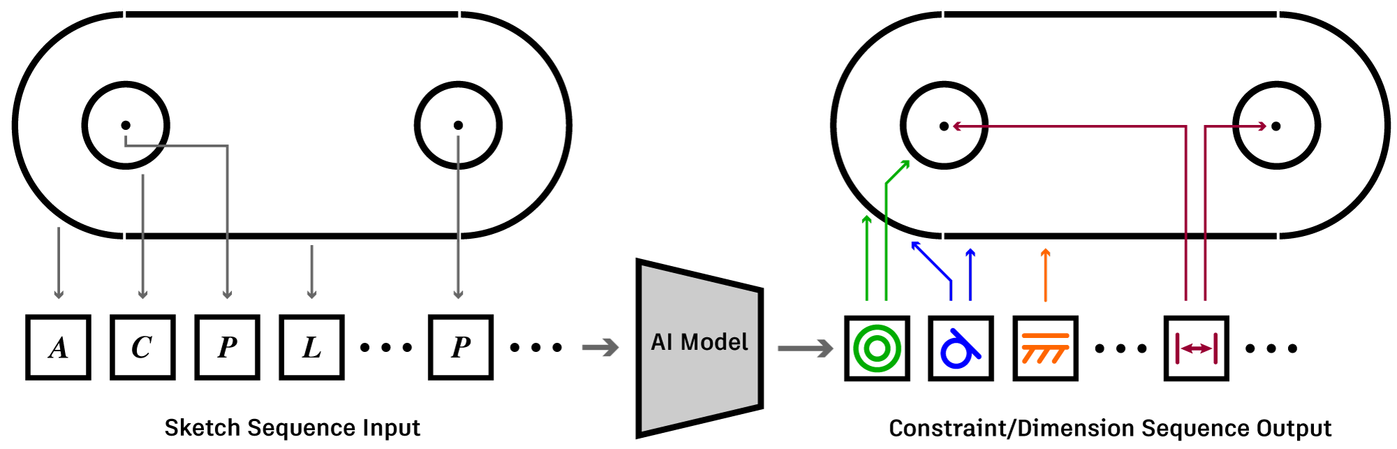 As explained on the Fusion blog, ‘defining constraints manually is an essential but often tedious task’. To alleviate this pain point, we developed a machine learning model to predict dimensions and constraints. Our model takes an engineering sketch as input and predicts a sequence of dimensions and constraints that reference the geometric primitives in the sketch.