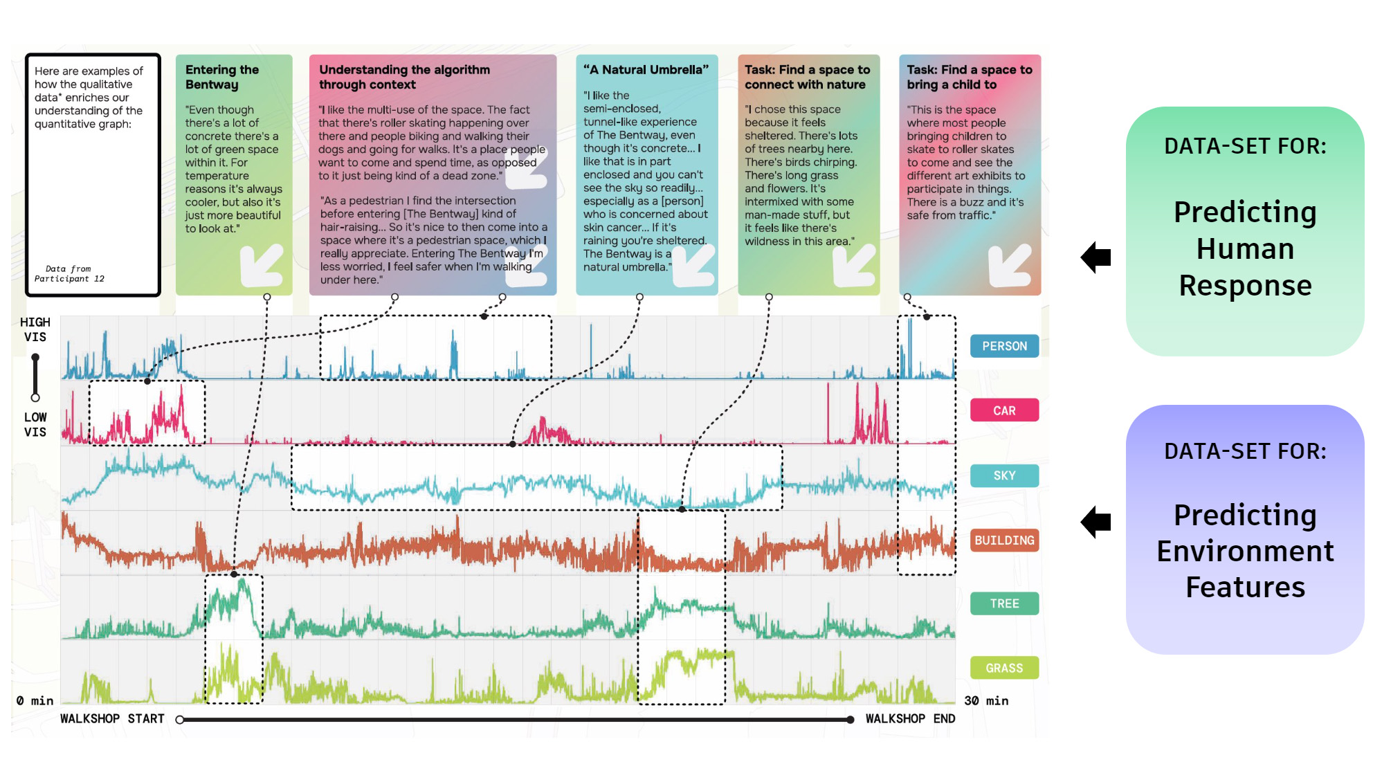 To understand and predict how objective features in a space connect with subjective experiences, the Autodesk Research team built an experimental participatory design platform in collaboration with The Bentway. Participants engaged in “walkshops,” in which they walked the length of The Bentway as multimodal data about their experience was recorded in various ways: